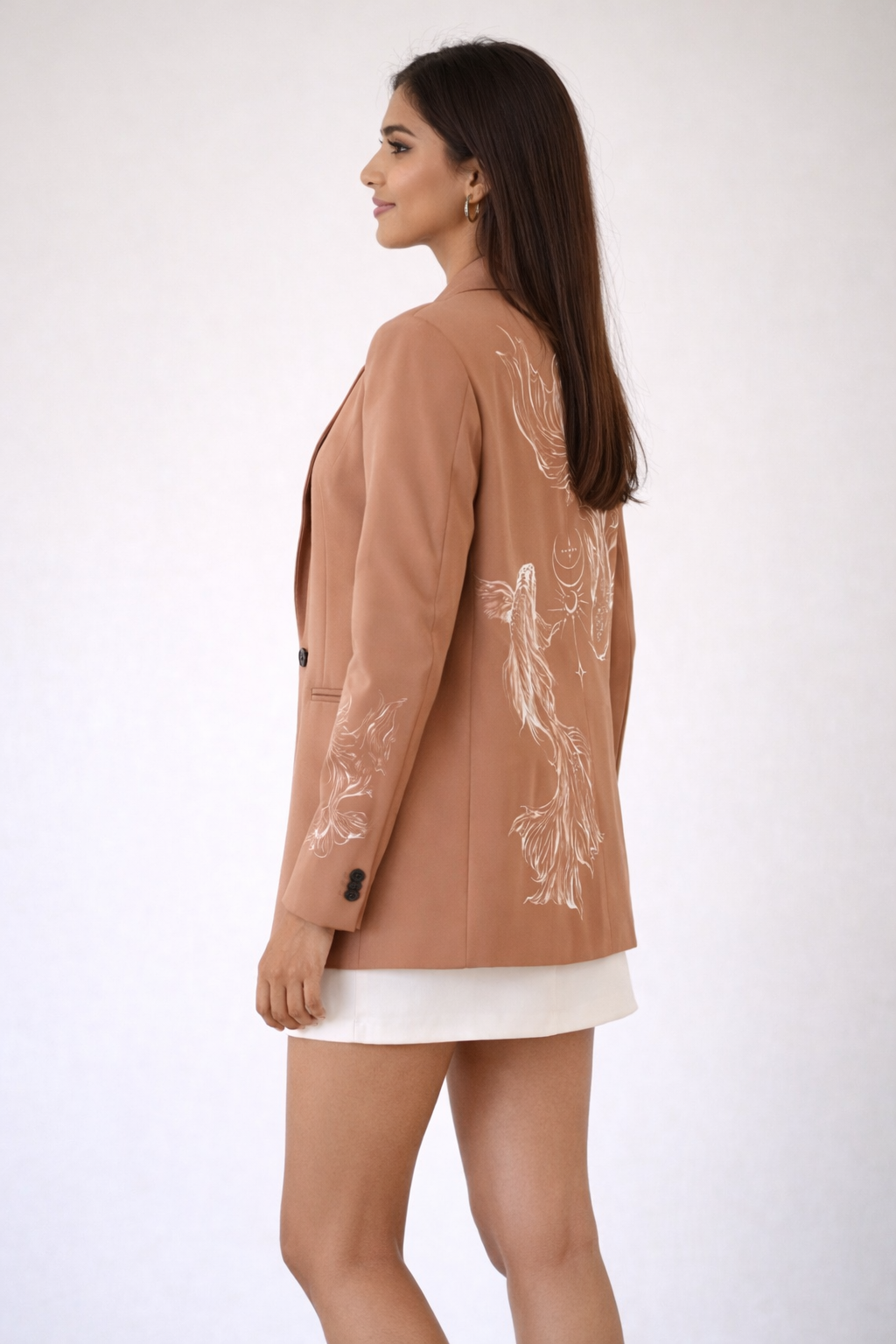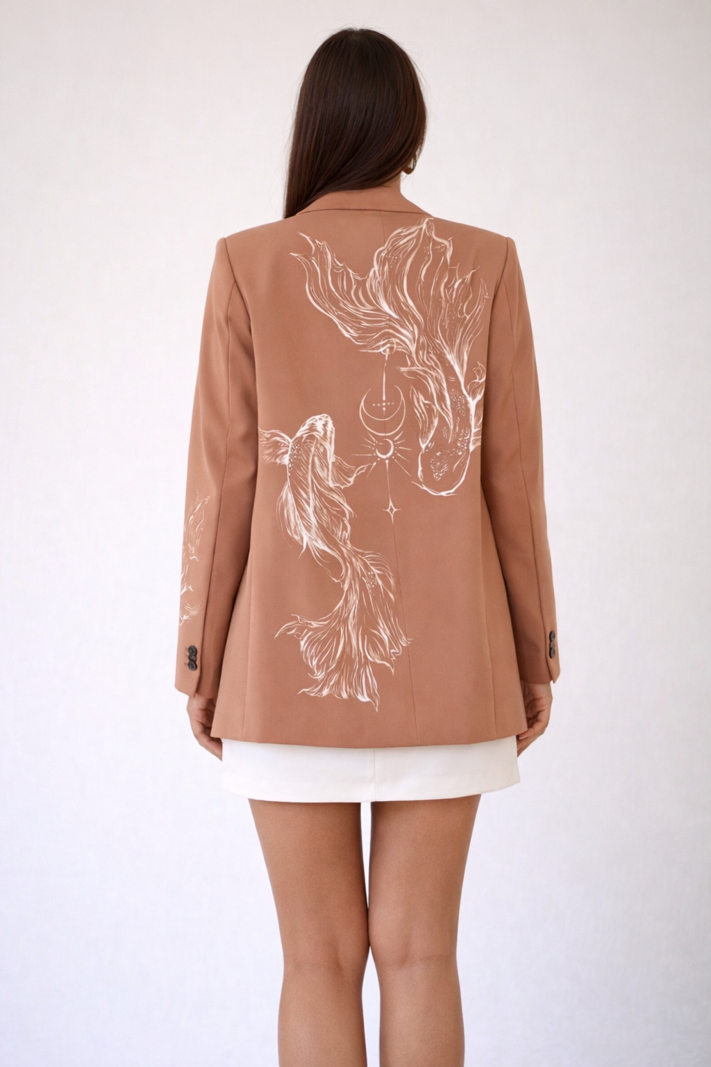 The placement of the artwork is strategically designed to flow naturally across the shoulder and torso, ensuring a balanced yet bold aesthetic. Combining the structure of traditional tailoring with the freedom of fine art, this blazer is an ideal choice for those looking to inject personality and creativity into their formal or semi-formal wardrobe.