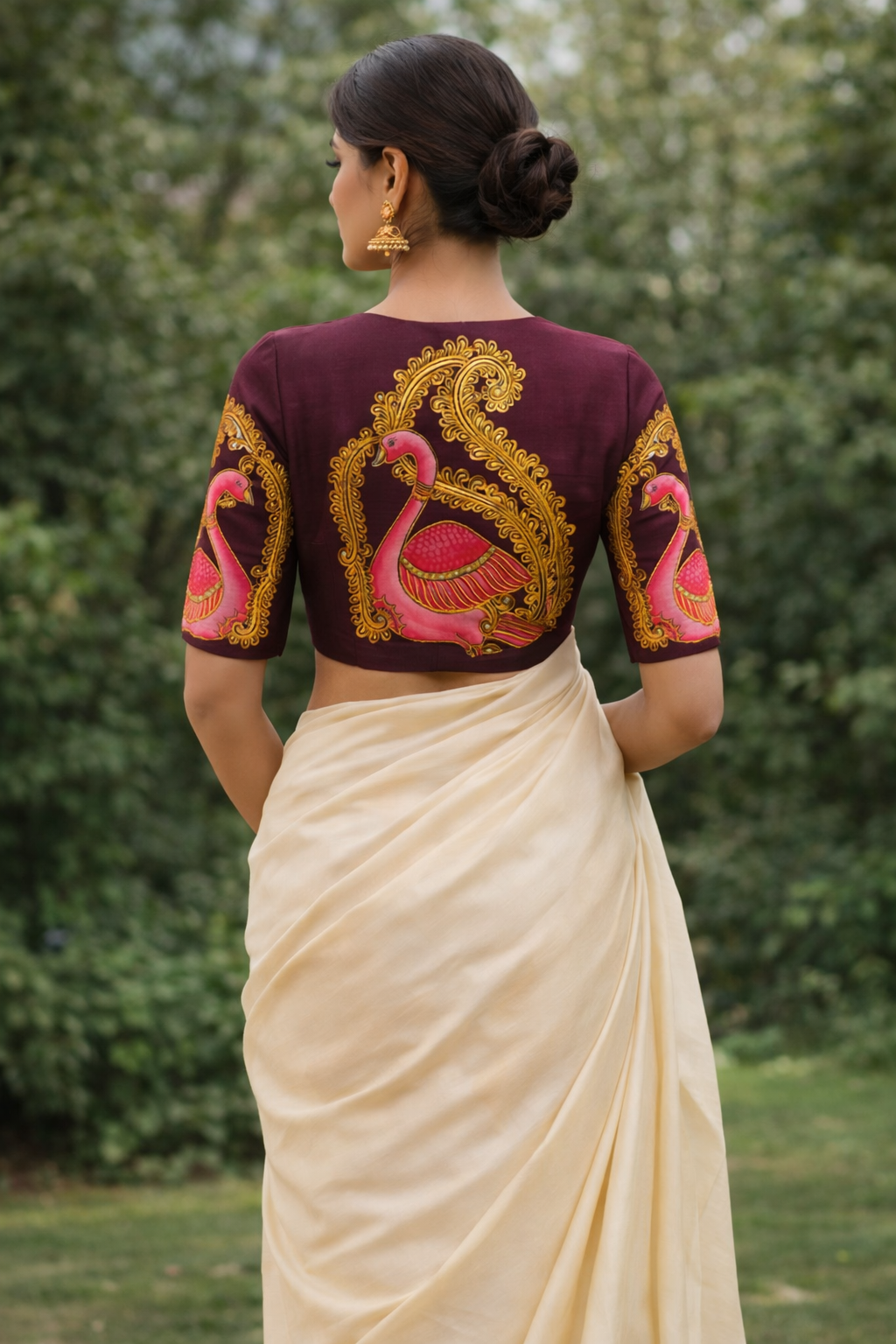 Pair this statement blouse with a solid-colored Tussar or Chanderi silk saree in cream, gold, or beige to allow the intricate back design to be the center of attention.