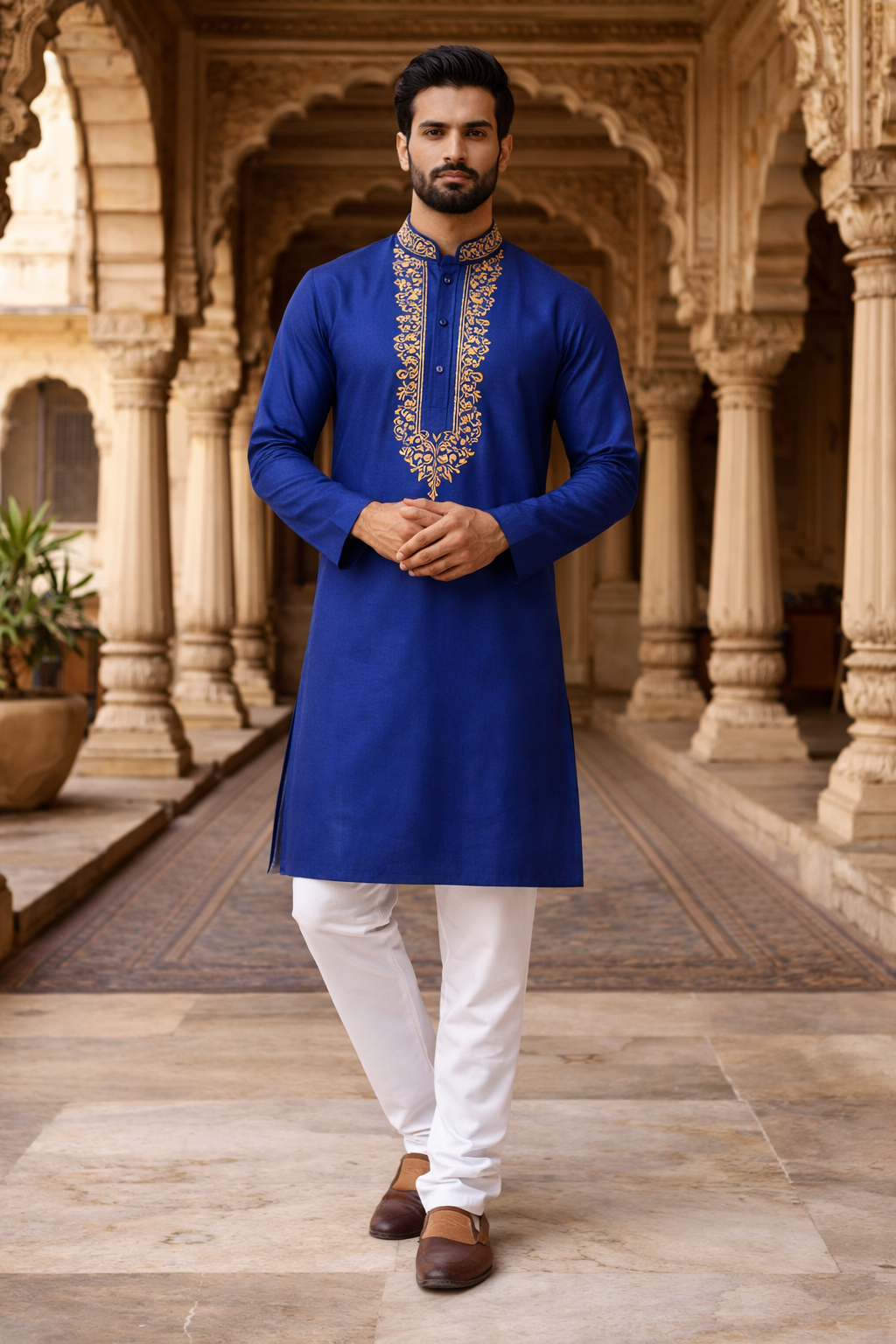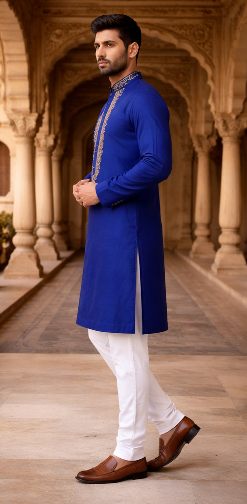 Pair this bold blue kurta with crisp white Aligarh pajamas or slim-fit trousers. Finish the ensemble with dark brown leather loafers or Mojares for a sophisticated, high-end look.