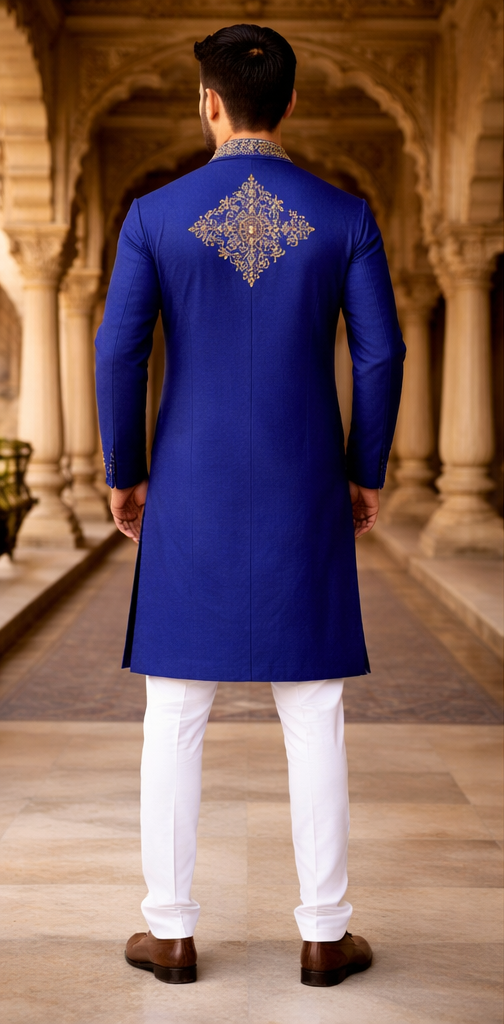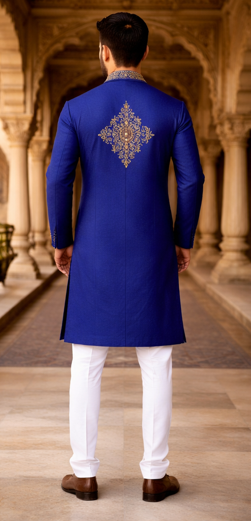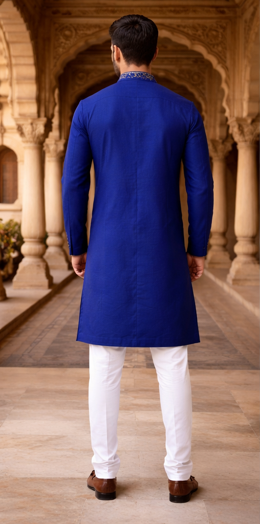 Make a powerful style statement with the Finex Fab Royal Blue Kurta. This piece is designed for the modern man who appreciates fine detailing from every angle. While the front showcases traditional gold embroidery that frames the face, the back features a signature geometric gold motif, ensuring you stand out even as you walk away.