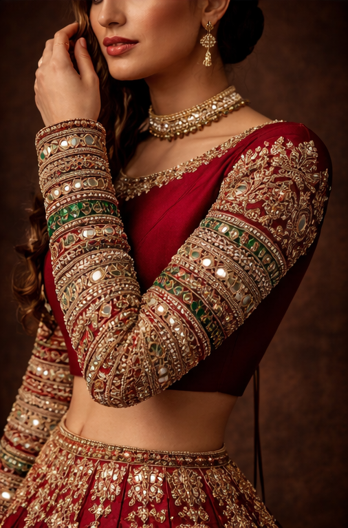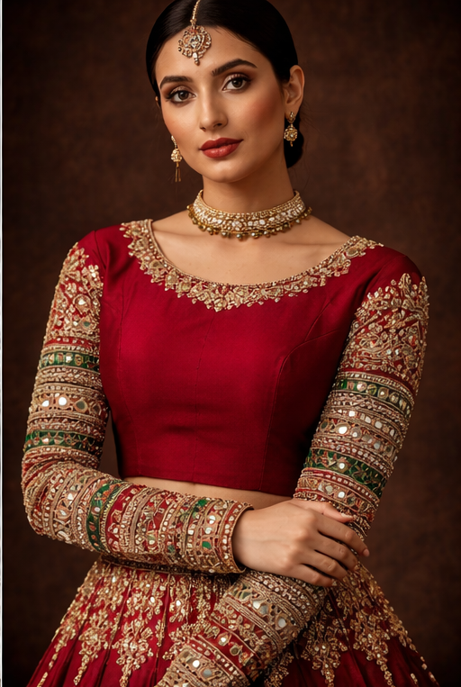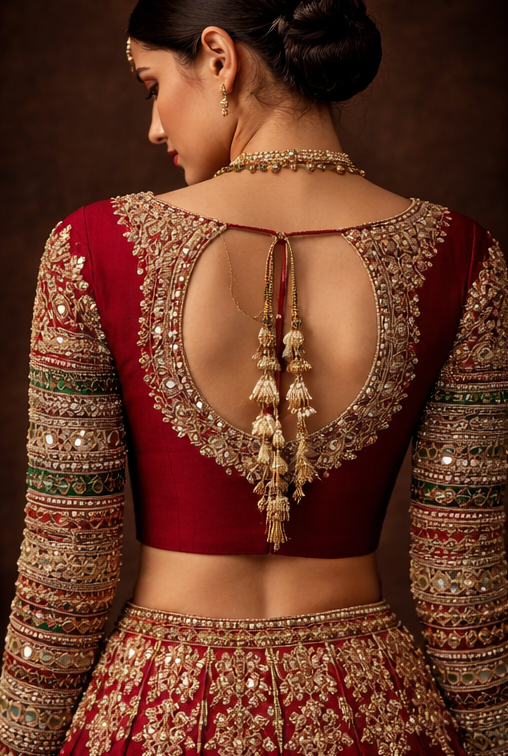 The finely detailed neckline adds a regal touch, making it perfect to pair with lehengas, sarees, or bridal outfits. Designed to elevate your festive and wedding wardrobe, this blouse ensures you stand out with unmatched elegance.